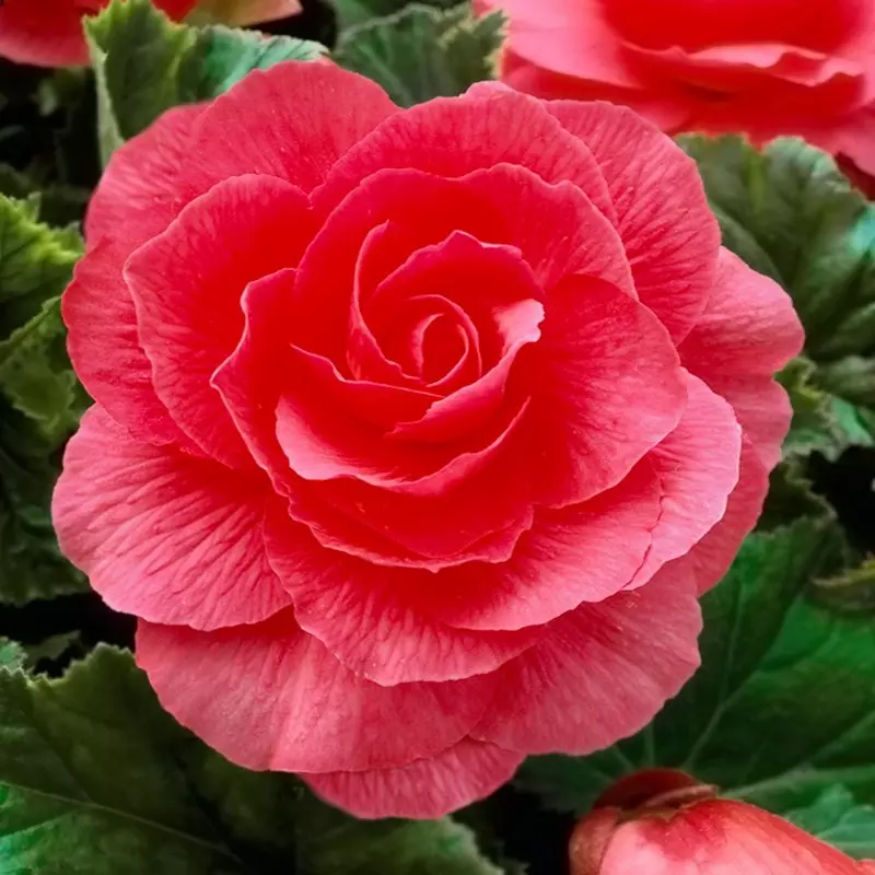 The vibrant pink blooms of this Large Flowered Double 'Pink' Begonia are perfect for adding a splash of colour to summer containers. With huge, rippled flowers which shine against deep green, serrated foliage - a wonderful contrast for the soft, rose-like blooms.