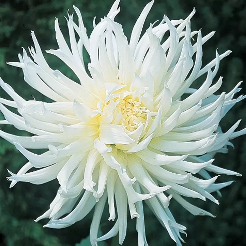 A mass of twisting, slim, ivory petals constitute each impressive flower. Bursting forth into bloom from July, and flowering over an exceptionally long season. The ruffled flowerheads of the Semi-Cactus Dahlia 'White Star' are tinted a warm shade of clotted cream towards the centre of each bloom.