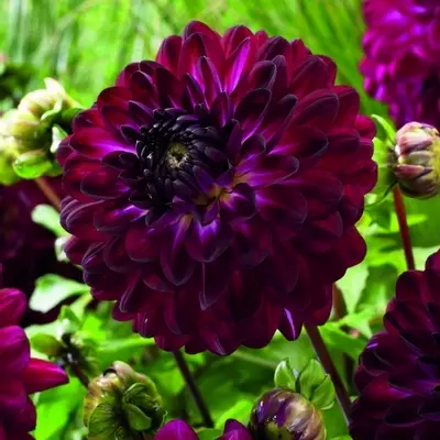 To grow Dahlias, select a sunny spot with well-drained soil, and dig a 30cm deep hole. Plant the tuber 10cm below the soil surface, spacing multiple tubers 45cm apart, or 90cm for taller varieties. Water consistently, maintaining moist but not saturated soil and protect new shoots from slug damage with eco-friendly methods. Feed plants during the blooming period with liquid plant food. Provide support for stems which will reach 60-90cm tall depending on variety. Enjoy spectacular blooms from late summer until first frosts. Cut or deadhead the flowers regularly for a continually flourishing display. Once blooming has finished, cut back foliage before lifting, drying and storing the tubers in peat-free substitute, in a frost-free place until the following spring.