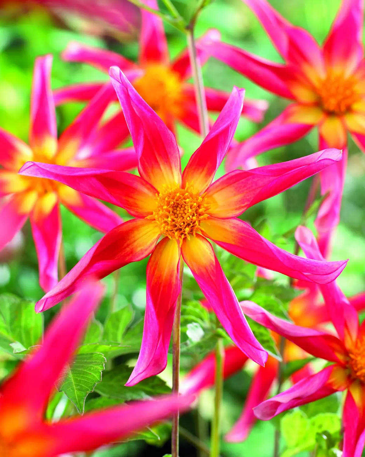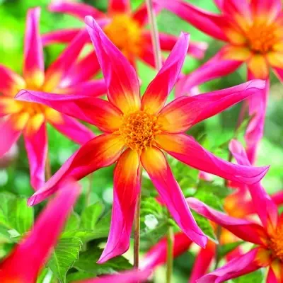 An exceptional dahlia, 'Honka Surprise' stands out with its captivating star-shaped beauty. Each unique dark pink almost red bloom melts towards the yellow centre and offers a haven for pollinators through the flowering period of mid summer to the first frosts.