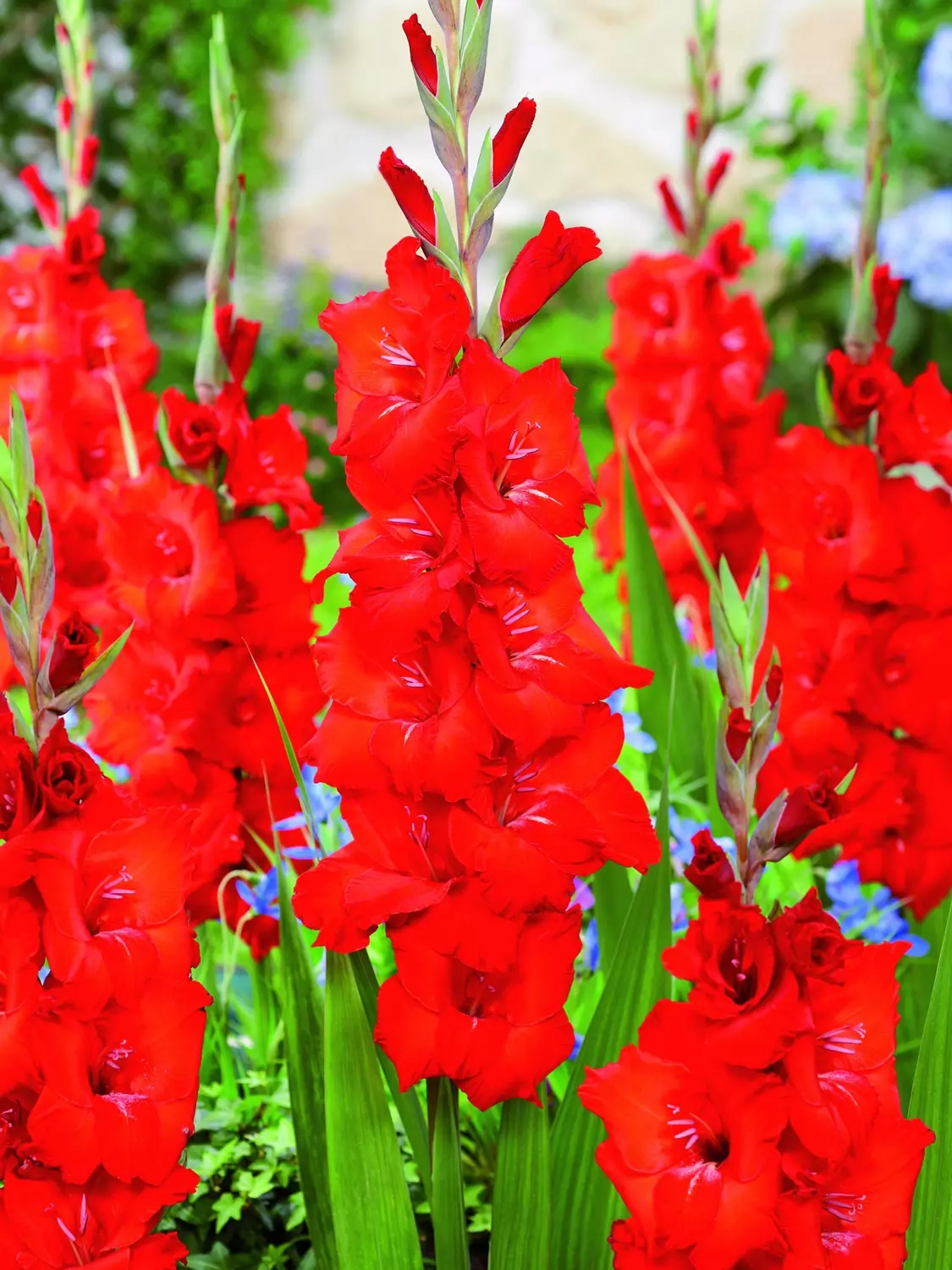 To cultivate Gladioli, choose a sunny site with well-drained, well-manured garden soil. Dig a trench 15cm deep and place the corms 10-15cm apart, covering with soil and ensuring they sit 5cm below the surface. Water regularly, maintaining soil moisture until growth is established, and during hot, dry spells of weather. Stagger planting at two-week intervals to ensure continuous flowering over a long period. Expect stately, colourful spikes reaching 60-90cm in height which many require staking for support. The smaller variety ‘Glamini’ Gladioli will reach a maximum height of 50cm.
