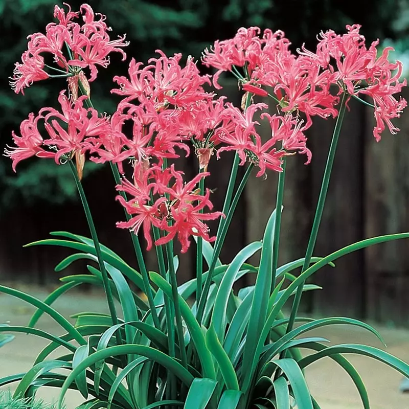Held in clusters on long, fine stems, each delicate bloom features slim, reflexed petals with finely crimped edges. Native to South Africa, Nerines enjoy basking in full sun, planted in well-drained soil.