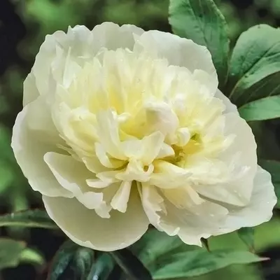 Double white petals with a hint of sulphur-yellow create a graceful, fragrant bloom in Paeonies 'Duchess de Nemours'.