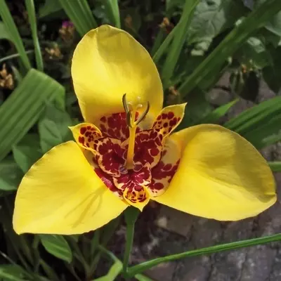 Lemon-yellow petals with exotic red markings highlight Tigridia 'Canariensis', often known as the ‘peacock flower’. Very few flowers are as beautiful or more picturesquely coloured than tigridia.