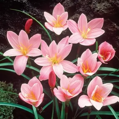 Zephyranthes 'Rosea', often called the Pink Rain Lily, is a charming miniature known for beautiful light pink blooms that appear after warm summer rains. Each flower is a petite, open trumpet, glowing against a neat tuft of slender, grass-like foliage.