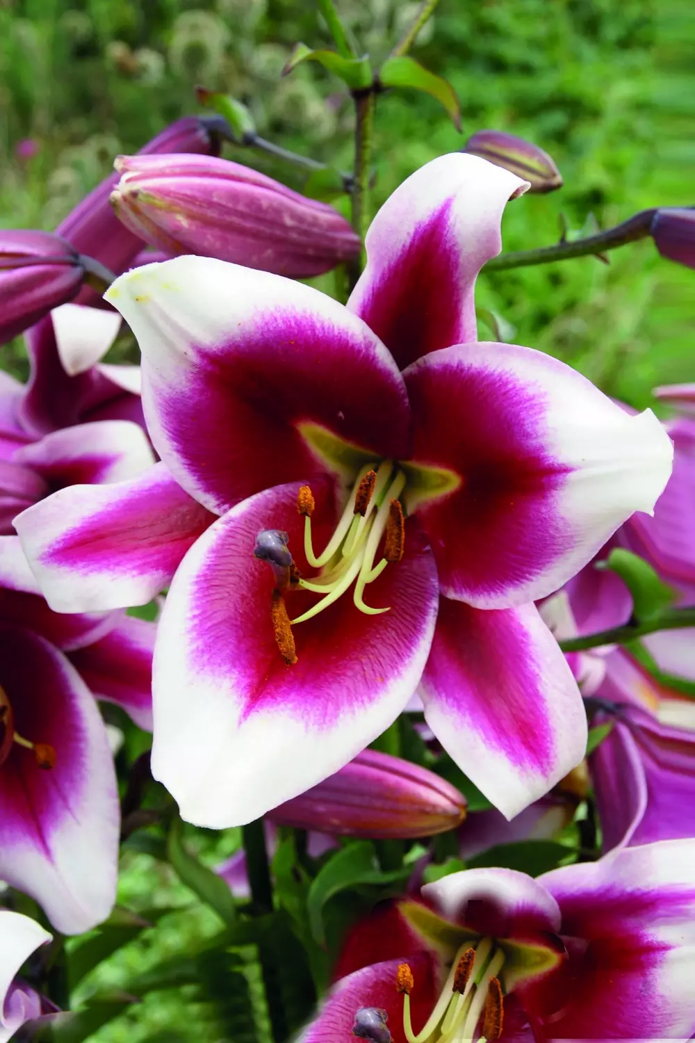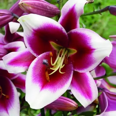The Oriental Trumpet Lily ‘Friso’ is a true showstopper, unveiling dramatic blooms that blend deep, velvety magenta centres with softly glowing white petal edges. Standing tall on sturdy stems, growing to a majestic height of 140 cm.