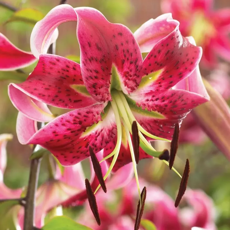 To cultivate lilies, choose a sunny spot with well-drained soil, digging a hole 15cm deep. Plant the bulbs 15-23cm apart, ensuring they sit 15cm below the soil surface. Water the surrounding soil well, maintaining soil moisture until growth emerges. Young shoots may be susceptible to slug damage, so use wildlife-friendly methods such as a top layer of sand to protect emerging growth. Most Lilies can also be grown in pots – ensure containers are deep and have large drainage holes in the base. As the majestic stems ascend, they will reach heights of 45-150cm, depending on variety. Support taller cultivars with stakes as they grow. Use dilute, balanced liquid plant feed every two weeks during the summer. Spray as soon as you notice the bright red lily beetle or their larvae.