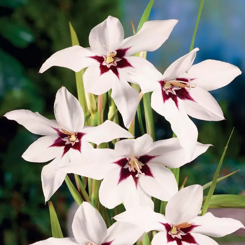 The sleek, understated sister of Gladioli, Acidanthera ‘Callianthus Murialae’ oozes elegance and refinement. Shapely white petals encircle a star-shaped maroon centre, and the blooms are skirted by long, lithe leaves. In addition to stylish form, ‘Callianthus Murialae’ is enveloped in a cloud of captivating fragrance, with a heady, tantalising scent.