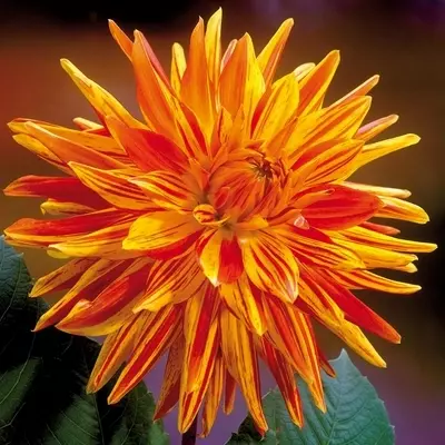 Cactus Dinner Plate Dahlia ‘Striped Vulcan’ features rich, honey-yellow petals, uniquely marked with vermillion stripes and splashes. Similar to a firework sparkler, the bright colours on this dahlia are illuminating.