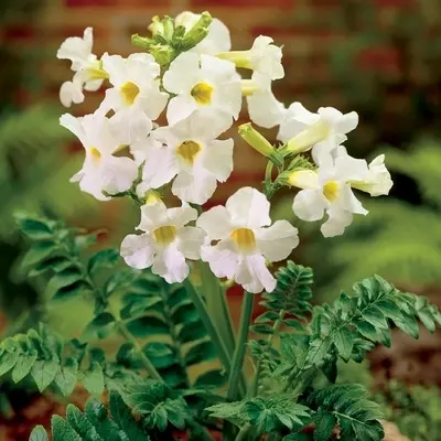 Like a snowy peak at the summit of a mountain, Incarvillea ‘Snowtop’ is a flurry of gleaming white. With abundant clusters held aloft on sturdy stems, the pristine petals glimmer against rosettes of deeply divided, fern-like leaves.