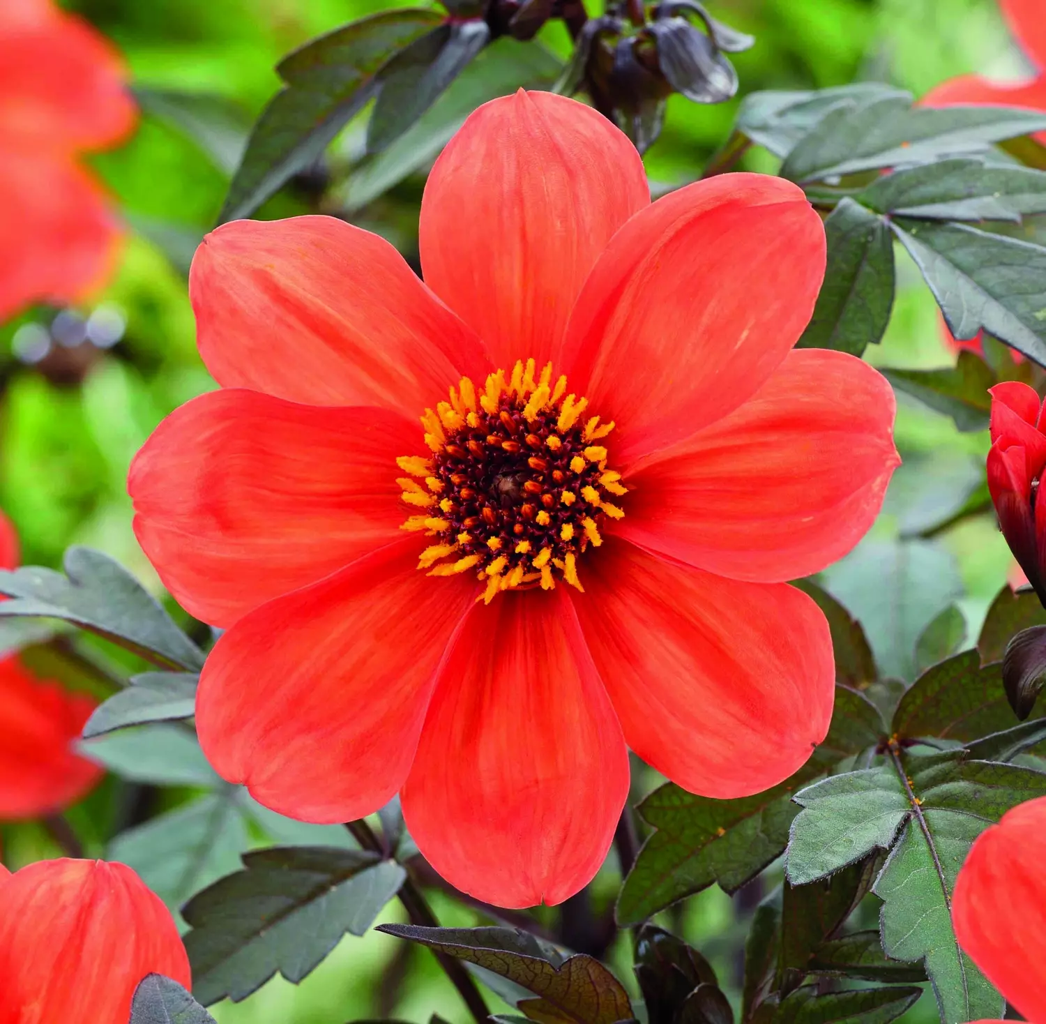 A slightly more compact dahlia which packs a punch in containers and pots and requires no staking or support. This brilliant 'Bishop of Oxford' dahlia may be planted in the middle or towards the front of a garden border, to add tropical colour and depth with its wonderful rich foliage and bright blooms.