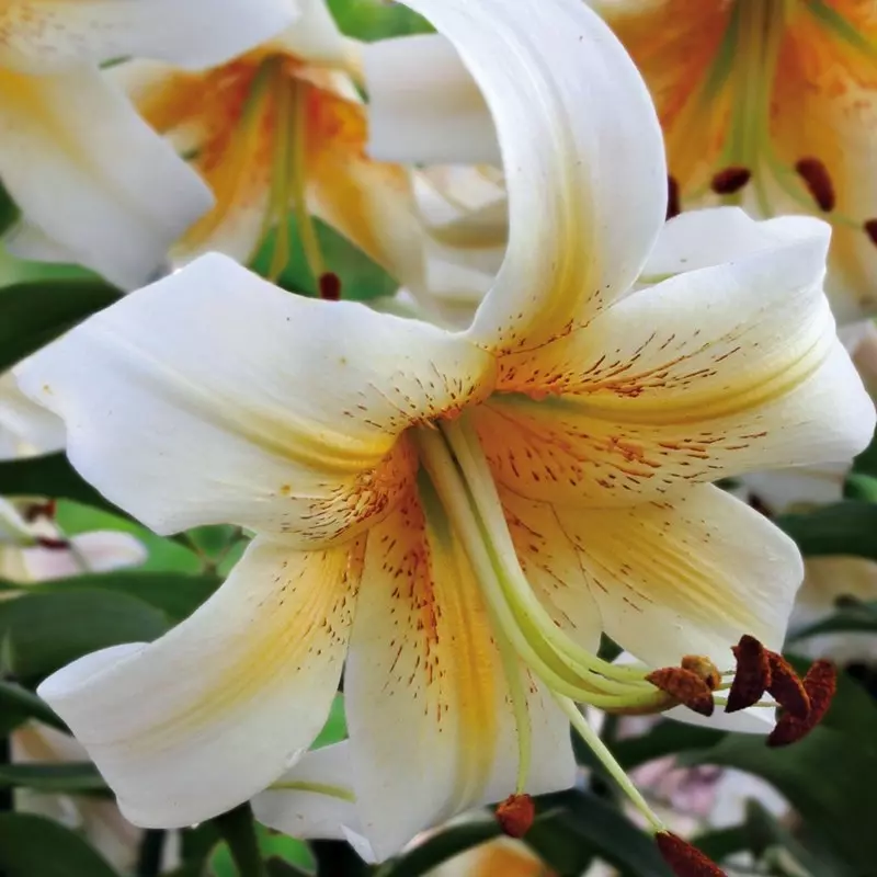 Golden yellow hearts framed by creamy white petals give Oriental Trumpet Lily 'Mister Cas' a stately presence in any garden. Its tall, reaching 120 cm, sturdy stems, carry these fragrant flowers that attract comments from admirers.