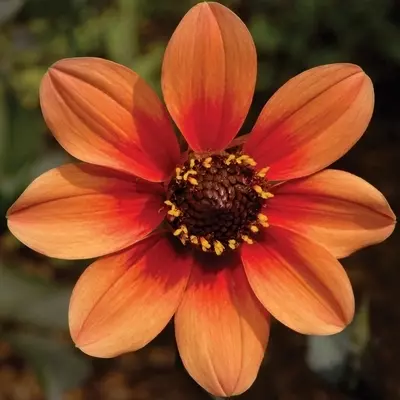The single daisy-like flowers feature soft peach petals which deepen to a ring of orange-red around a pollen-rich centre. Single Flowered Dahlia 'HS Date' grows to a height of 90 cm tall and is great for large, bold feature pots and for planting in mixed borders with shrubs and grasses.