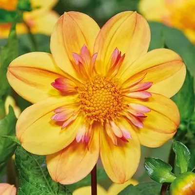 The refined daisy-like blooms are made up of an outer ring of large apricot-yellow petals and a second, smaller layer of soft sunset-pink and peach frills. In the middle of each collarette dahlia 'Kelsey Annie Joy' blushing bloom sits a golden, nectar-packed centre – a haven for pollinators.