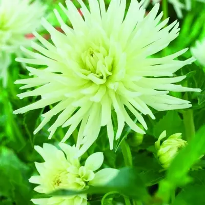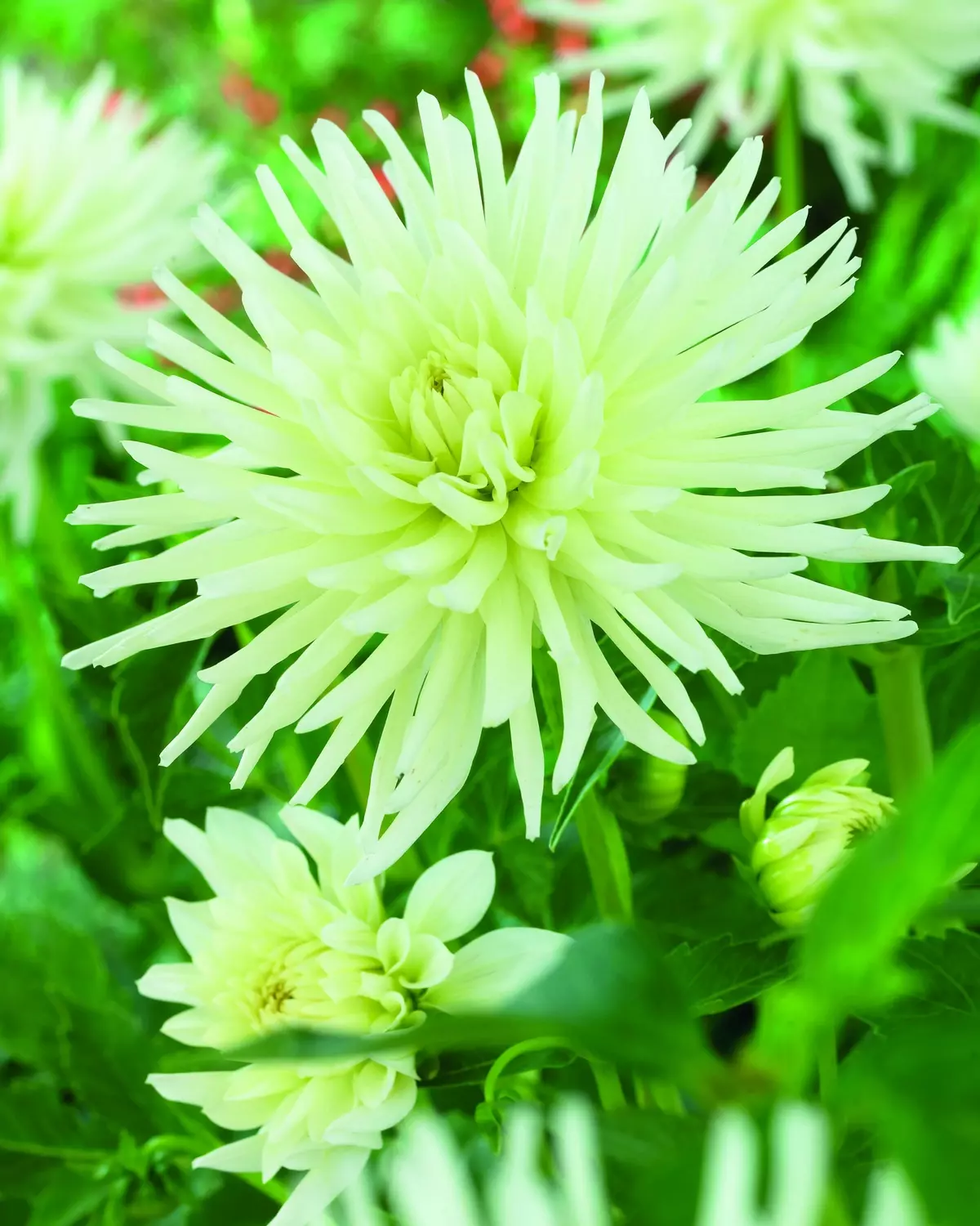 Although compact at 60 cm, cactus dahlia 'Playa Blanca' creates a luminous focal point in garden beds, borders and containers. Its clean, bright white petals pair beautifully with both bold colors and soft pastels, adding a crisp elegant note to any planting scheme.