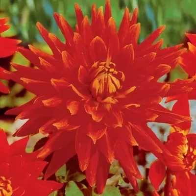 ‘Vulcan’ was the Roman god of fire - a name perfectly befitting this strong, sizzling cactus dinner plate dahlia. Looks brilliant when grown next to rich red, purple and orange dahlias, of varying heights and forms. Growing to a height of 120 cm.