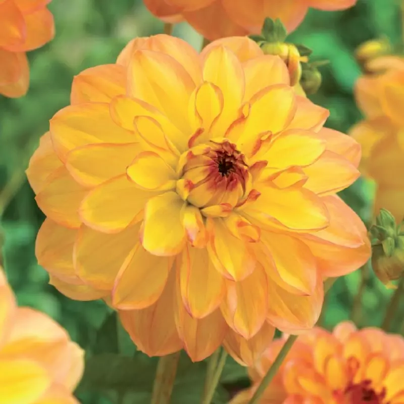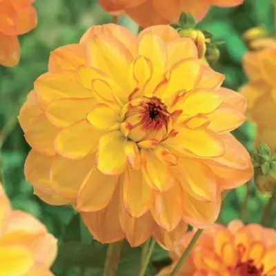 To grow Dahlias, select a sunny spot with well-drained soil, and dig a 30cm deep hole. Plant the tuber 10cm below the soil surface, spacing multiple tubers 45cm apart, or 90cm for taller varieties. Water consistently, maintaining moist but not saturated soil and protect new shoots from slug damage with eco-friendly methods. Feed plants during the blooming period with liquid plant food. Provide support for stems which will reach 60-90cm tall depending on variety. Enjoy spectacular blooms from late summer until first frosts. Cut or deadhead the flowers regularly for a continually flourishing display. Once blooming has finished, cut back foliage before lifting, drying and storing the tubers in peat-free substitute, in a frost-free place until the following spring.