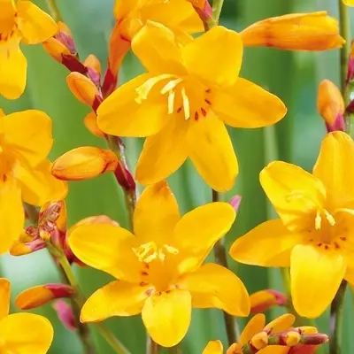 Golden yellow blooms on elegant arching stems make Crocosmia' Columbus' a vibrant feature in any summer garden. Large flowering variety growing to 50 cm.