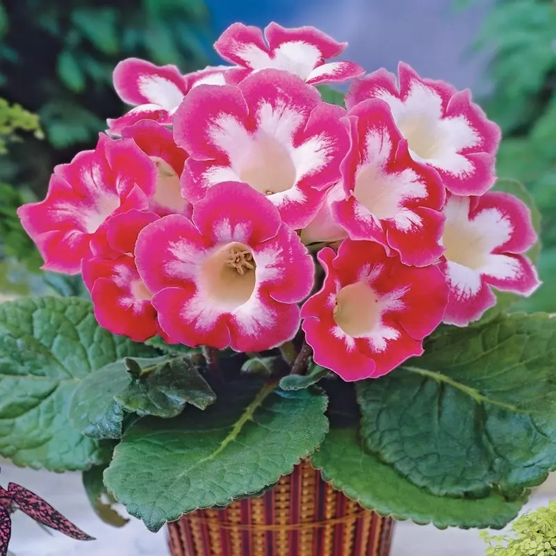 The charming bell-shaped, bi-coloured blooms of Gloxinia ‘Blanche de Meru’ are displayed in a compact cluster, like a petite posy for your windowsill. Each petal is strikingly edged in deep pink, highlighting a snow-white centre.