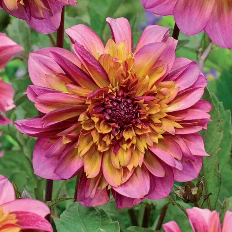 Raspberry pink petals are surrounded by a tighter cluster of golden yellow petals. This floral concoction provides a burst of glowing colour in late summer, with bountiful blooms measuring 12 cm, continuing all the way through to the first frosts.