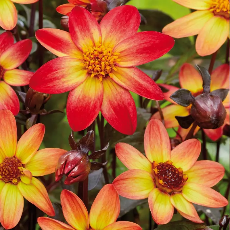 Dazzling looks and tropical tones make Single Flowered Dahlia ‘Star Wars’ a bold and brilliant choice to adorn summer containers with colour. Rich dark finely cut foliage, adds an interesting dimension to this spectacular compact dahlia and shows the exotic-looking blooms at their best.