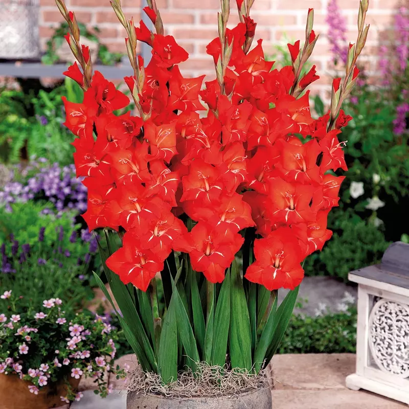 To cultivate Gladioli, choose a sunny site with well-drained, well-manured garden soil. Dig a trench 15cm deep and place the corms 10-15cm apart, covering with soil and ensuring they sit 5cm below the surface. Water regularly, maintaining soil moisture until growth is established, and during hot, dry spells of weather. Stagger planting at two-week intervals to ensure continuous flowering over a long period. Expect stately, colourful spikes reaching 60-90cm in height which many require staking for support. The smaller variety ‘Glamini’ Gladioli will reach a maximum height of 50cm.