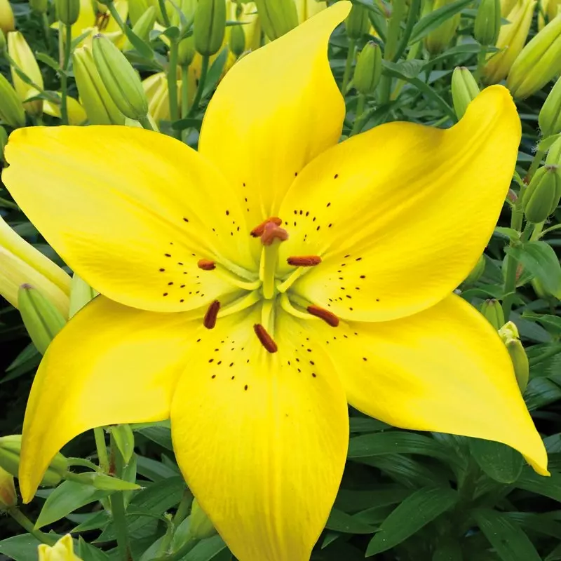 The canary yellow blooms of Asiatic Lily ‘Ilse’ sing of sunshine, bursting with enthusiasm and cheer. The flowers flaunt six broad, golden petals, freckled at the base, surrounding a crown of elongated stamens.