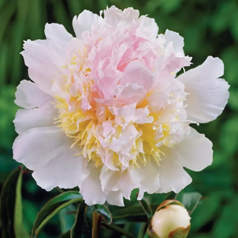 Showy large blooms of Paeonies 'Top Brass' combine white outer petals, pink inner accents, and a golden-yellow centre.