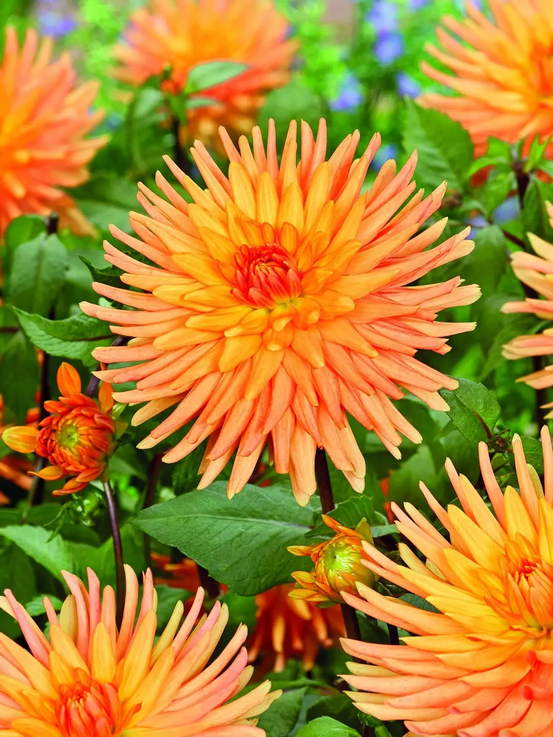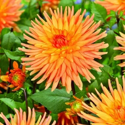 Commanding attention with its vivid colour and unique texture, Cactus Dahlia 'Ludwig Helfert' is perfect for creating a statement in any garden scheme. Bright orange, spiky petals form a striking starburst with masses of mid green foliage and dark purple stems.