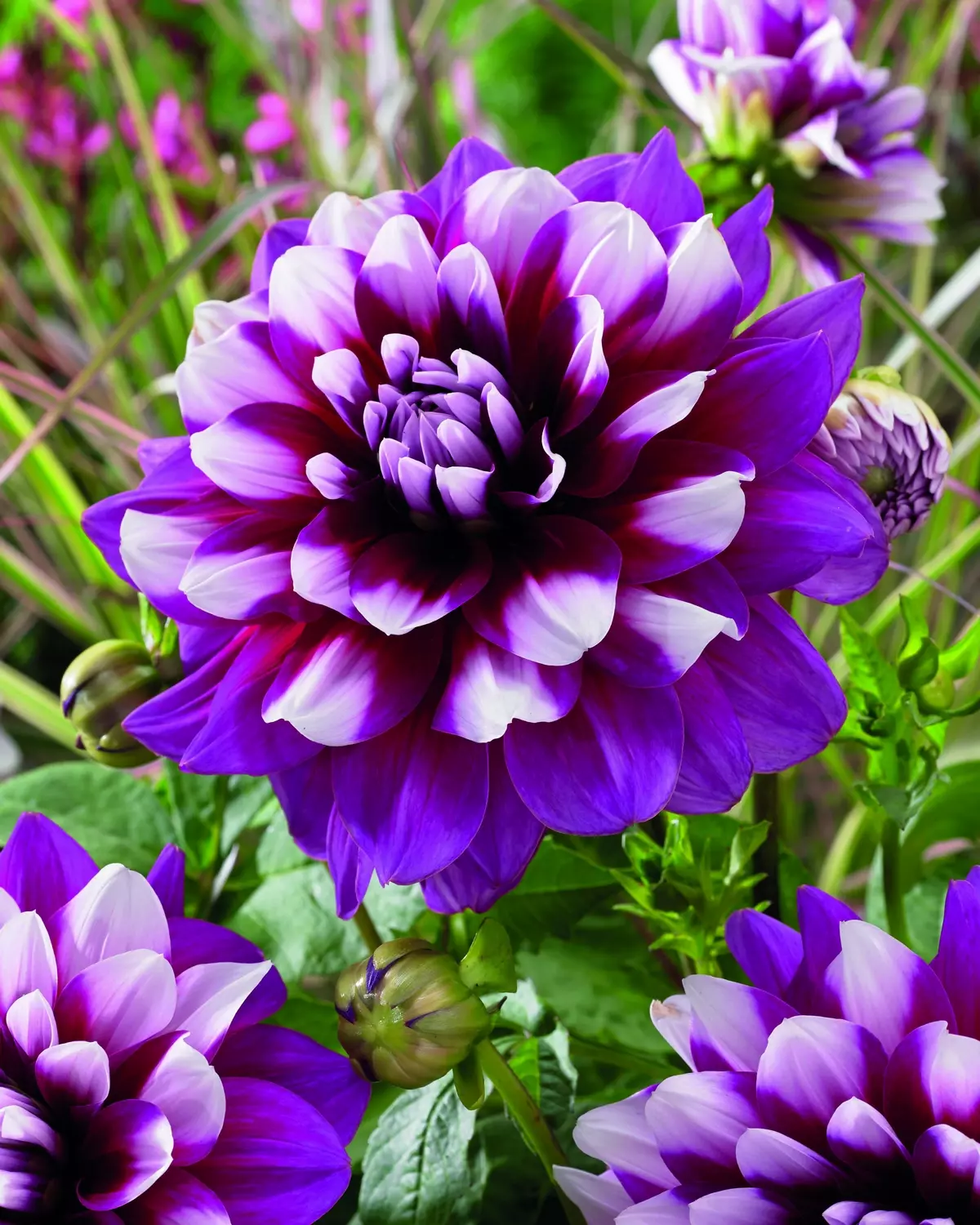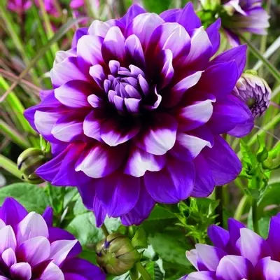 Attractive purple petals surround a pure white centre, creating a unique two-tone effect. Decorative Dahlia 'Patches' captivates with its lively contrast, adding depth and interest to garden arrangements with its height of 100 cm.