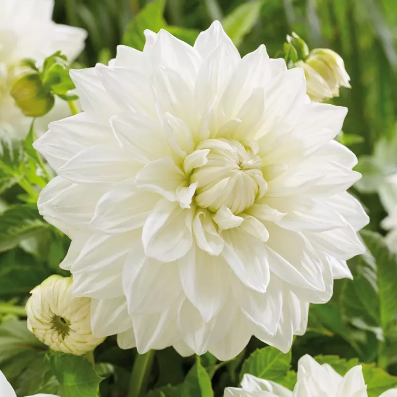 With luxurious flowers of alabaster white, Dinner Plate Dahlia ‘Bull’s Pride’ looks as though it has been carved from marble. The enormous, decorative, blooms measuring 24 cm burst forth throughout the summer until the first frosts.