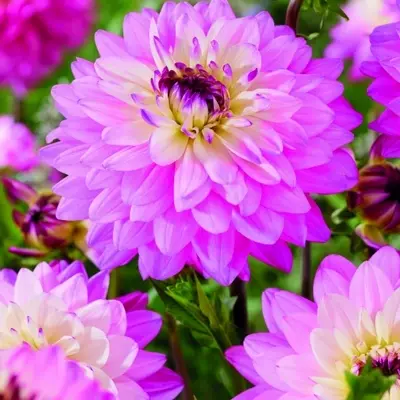 Blending seamlessly with other flowers, dahlia 'Luka Johanna' waterlily shaped flowers are perfect for cutting and containers as well as the borders. Blooms from July to September and reaches a height of 90 cm.