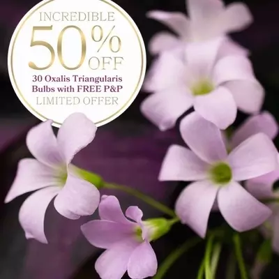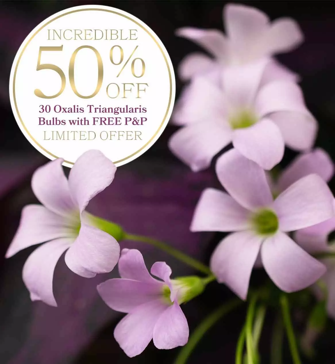 This HALF-PRICE offer is for 30 bulbs of Oxalis Triangularis. These 30 bulbs have a retail price with postage of £25.45. Your price WHILST STOCKS LAST is £12.50 with FREE delivery.