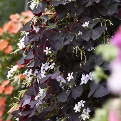 The dramatic foliage of Oxalis 'Triangularis Purpurea' truly sets this plant apart, creating a striking backdrop to the rose-pink, trumpet-shaped blooms. This remarkable species flaunts heart-shaped, trifoliate leaves of burgundy-black, each adorned with imperial purple markings at the centre.