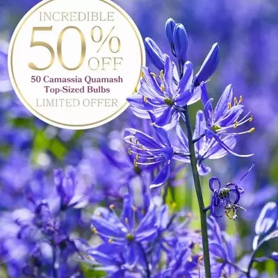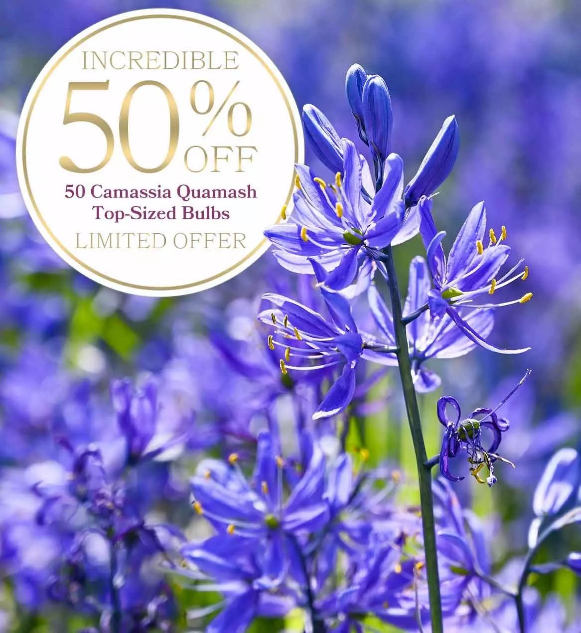 This HALF-PRICE offer is for 50 bulbs of Camassia quamash. These 50 bulbs have a retail price with postage of £20.95. Your price WHILST STOCKS LAST is £10.40 with FREE delivery.
