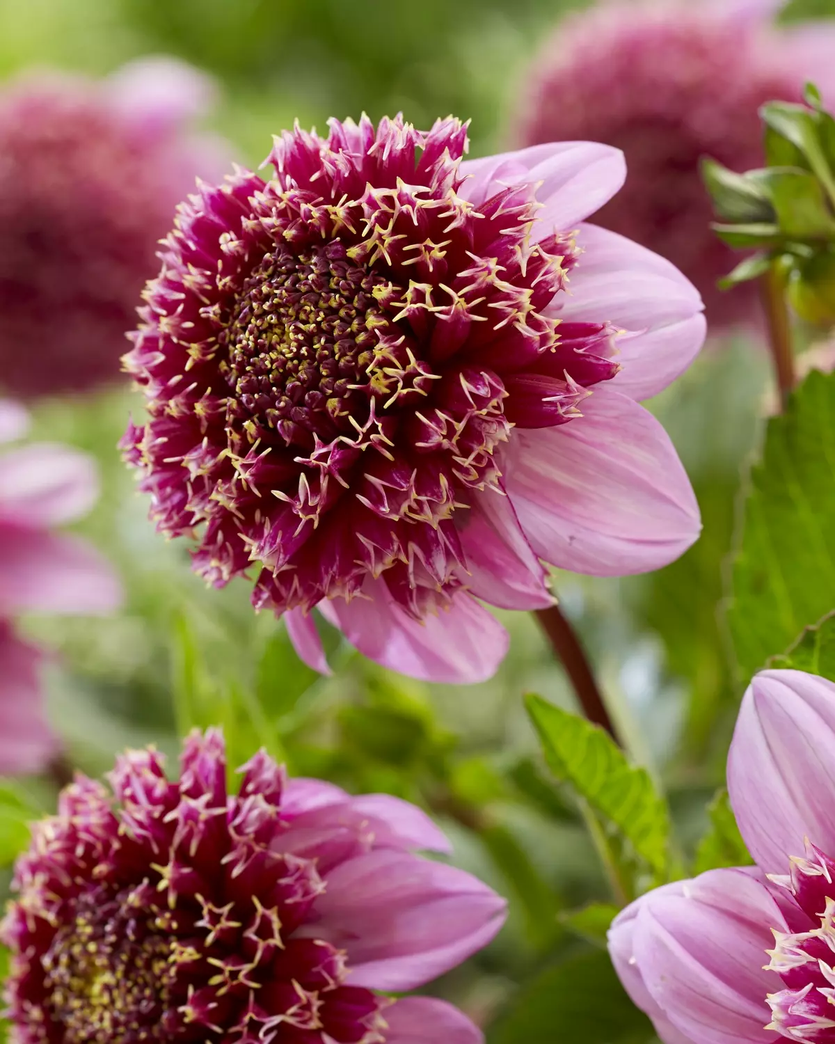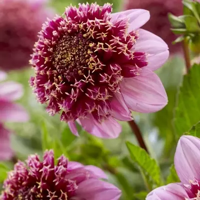 Anemone Flowering Dahlia 'Fenna Baaij' is distinguished by its soft pink colouring and elegant form. Each bloom measuring 10 cm features a rounded, cushion power puff centre with a touch of warm yellow in the centre which gives the flower a luminous, almost watercolor quality.