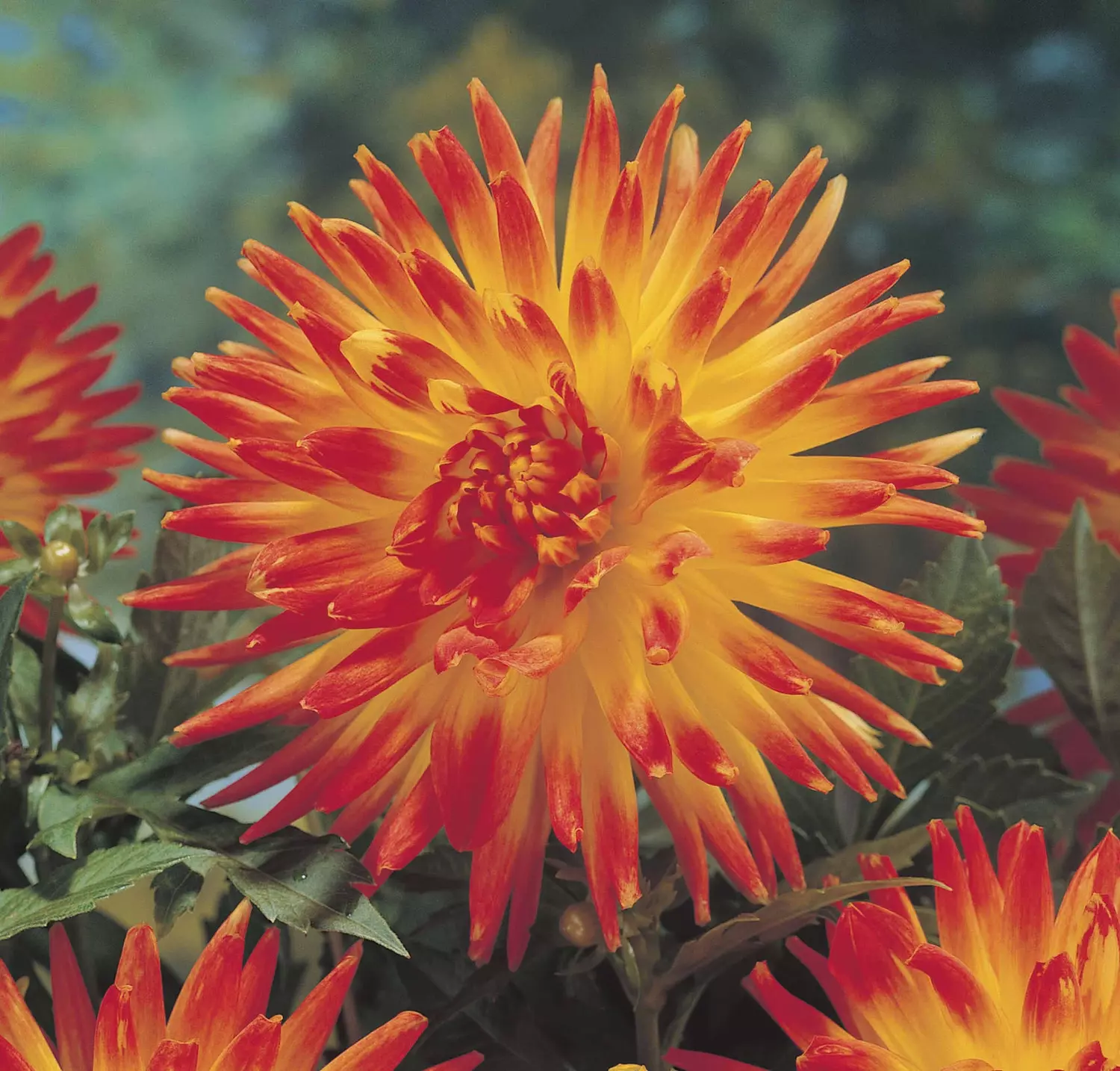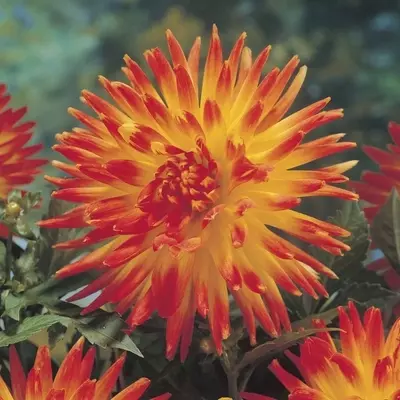 A dazzling bi-coloured spectacle of form and colour, Cactus Dahlia 'Gudosnik' creates a focal point in the garden. Each bloom bursts open in fiery shades of orange with deep orange-red tips and a warm yellow centre.