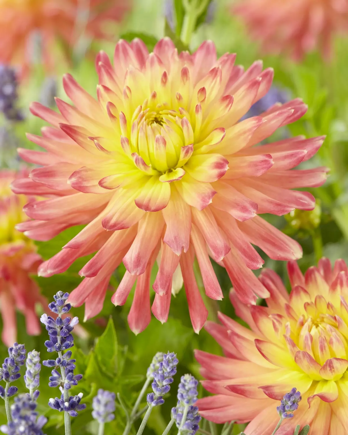 Dahlia 'Solar Flare' is a striking semi-cactus variety, glowing shades of coral pink to deep pink petals, forked tips and a soft yellow heart, creating a starburst effect. The dazzling blooms stands out in beds, borders, and cut-flower arrangements alike.