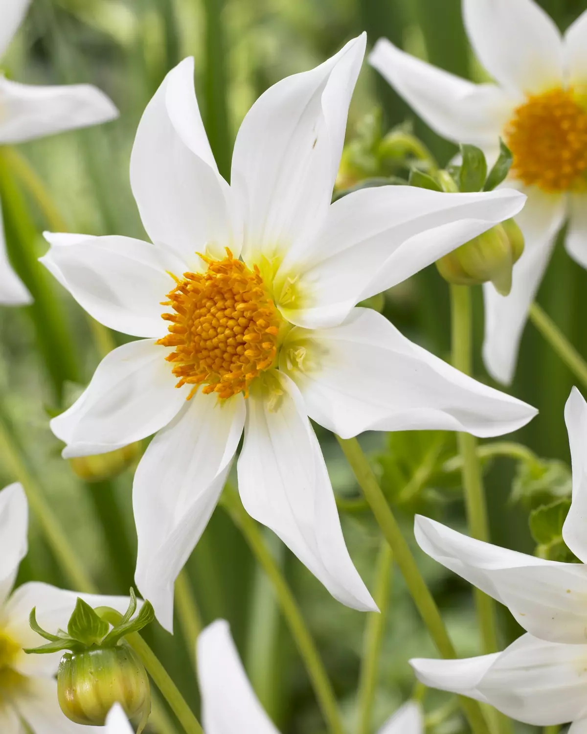 Dahlia ‘Honka White’ is a delicate starburst of pure elegance, its slender petals stretching outward in pure white points. Creating an almost translucent softness that contrasts beautifully with its warm, golden centre.