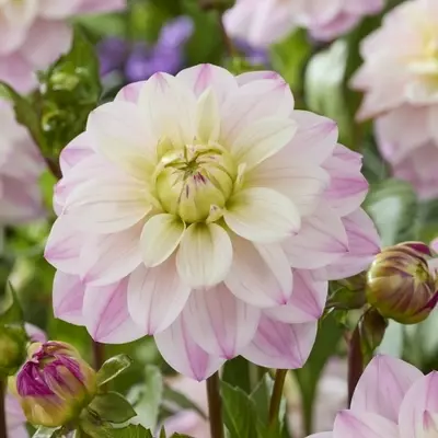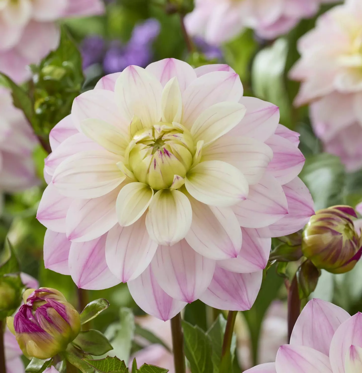 Decorative Dahlia 'Orion' enchants with its delicate palette of ivory white petals with subtle hints of pink towards the edge. Its continuous flowering throughout the season ensures a steady display of understated beauty. Growing to a height of 100cm.