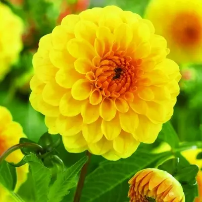 The blooms stand out glowing against fresh green foliage. Compact plant at 80 cm tall, pompom dahlia 'Golden Sceptre' continuous stream of blooms from midsummer to autumn, makes it ideal for borders and containers.