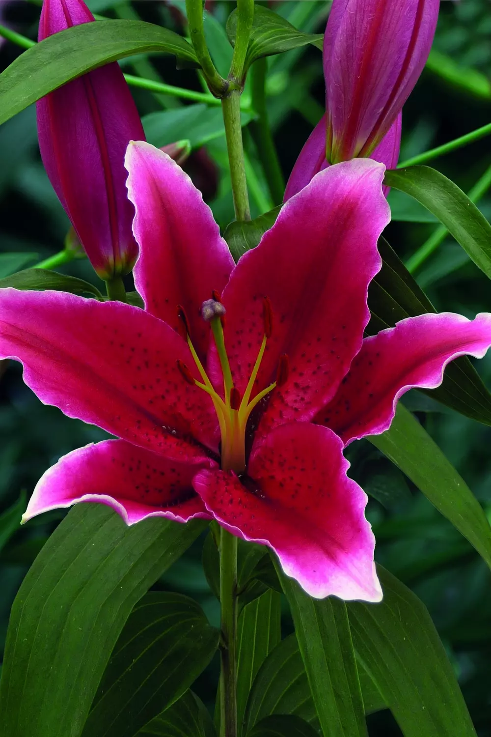 Oriental Lily 'Chartwell' is a strong and steady-growing lily that captivates with its seductive blooms. Each flower showcases rich burgundy-red with a paler edge fading to silky white, creating a dramatic, eye-catching contrast against the plant’s dark green foliage