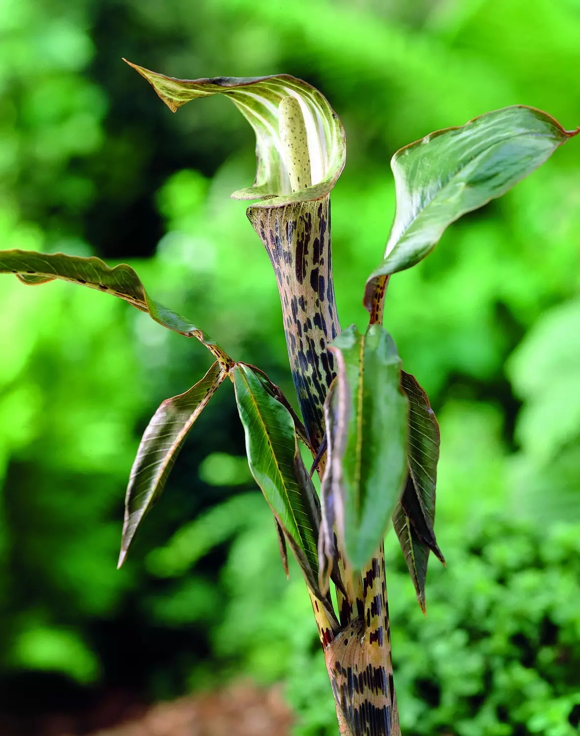 Spreading above the unusual flowers, broad, ornamental leaves are held on thick, mottled stems, creating a structural statement with their architectural form. An astonishing focal point for a damp, shady part of your garden.