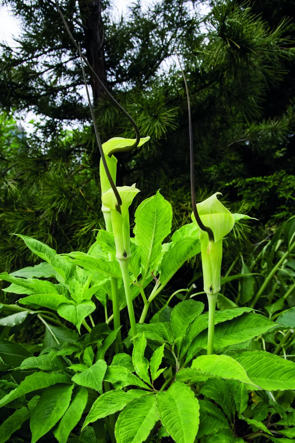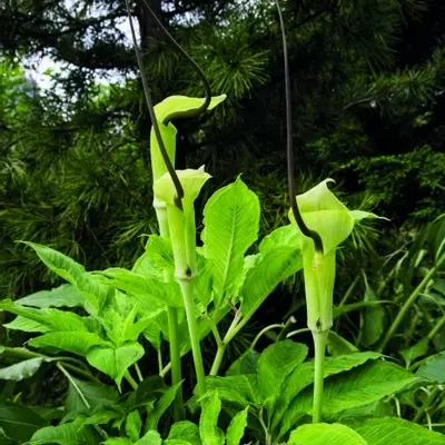 Arisaema 'Tortuosum' is a captivating Himalayan species that brings height, elegance, and a touch of the unexpected to shaded gardens. The spathe itself is typically green to olive with soft stripes or mottling, curving gracefully around the base of the towering spadix.
