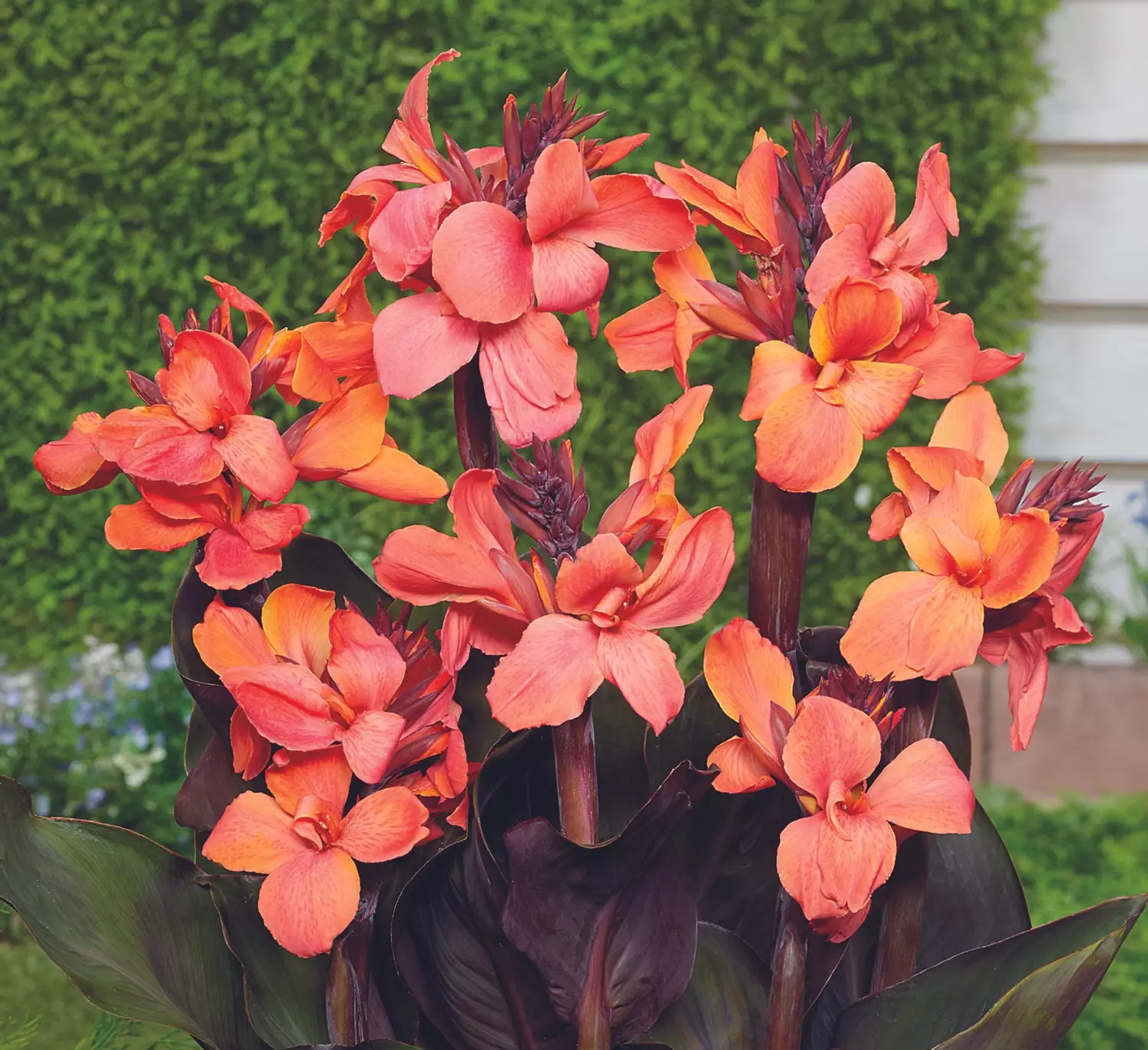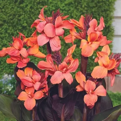 Lift rhizomes in autumn or bring pots undercover for the winter months as tender Cannas do not tolerate freezing temperatures.
