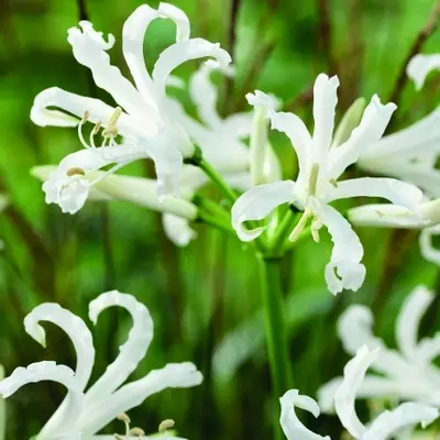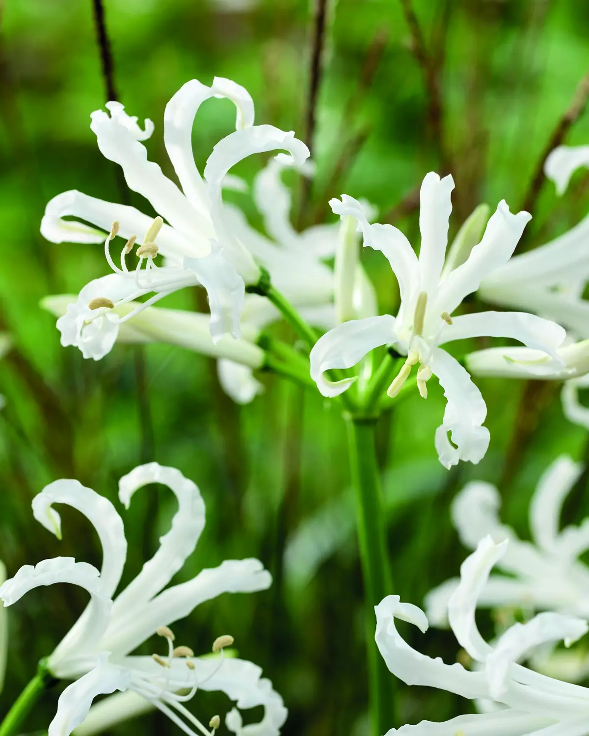 Nerine bowdenii ‘Like a Virgin’ is a beautifully refined perennial, celebrated for its pure-white blooms. Each flower features gracefully recurved petals that shimmer in the soft autumn light.
