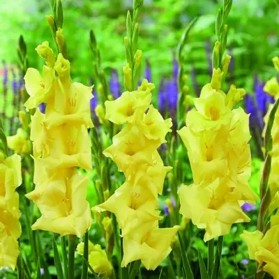 Glamini Gladioli 'Luna' is a dwarf gladiolus cultivar distinguished by its compact stature and vibrant yellow, funnel-shaped flowers. Part of the Glamini series, this variety reaches 50–60 cm in height, flowering from mid to late summer.