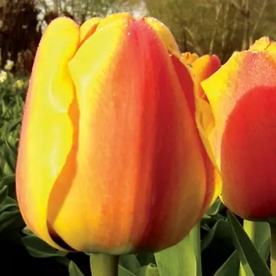 With brilliant, mandarin-red petals edged by a broad blaze of amber, ‘Darwin Tulip Apeldoorn Elite’ radiates a warm glow to illuminate your spring display. The enormous, long-lasting, egg-shaped blooms are carried on impressively long stems, making them a fantastic cut flower for bouquets and floral arrangements.