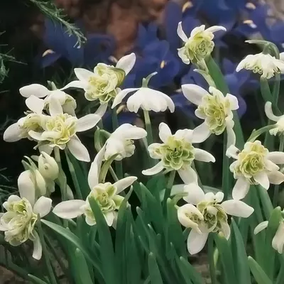 Galanthus nivalis Flore Pleno is an exquisite variety of double flowering snowdrop. Turn the pretty white nodding blooms upside down to see an intricate, ruffled arrangement of green and white petals and markings. The flowers are lightly scented too.