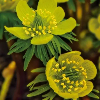 (Winter Aconite) Aconites spread by self-seeding, forming thickly populated colonies.
